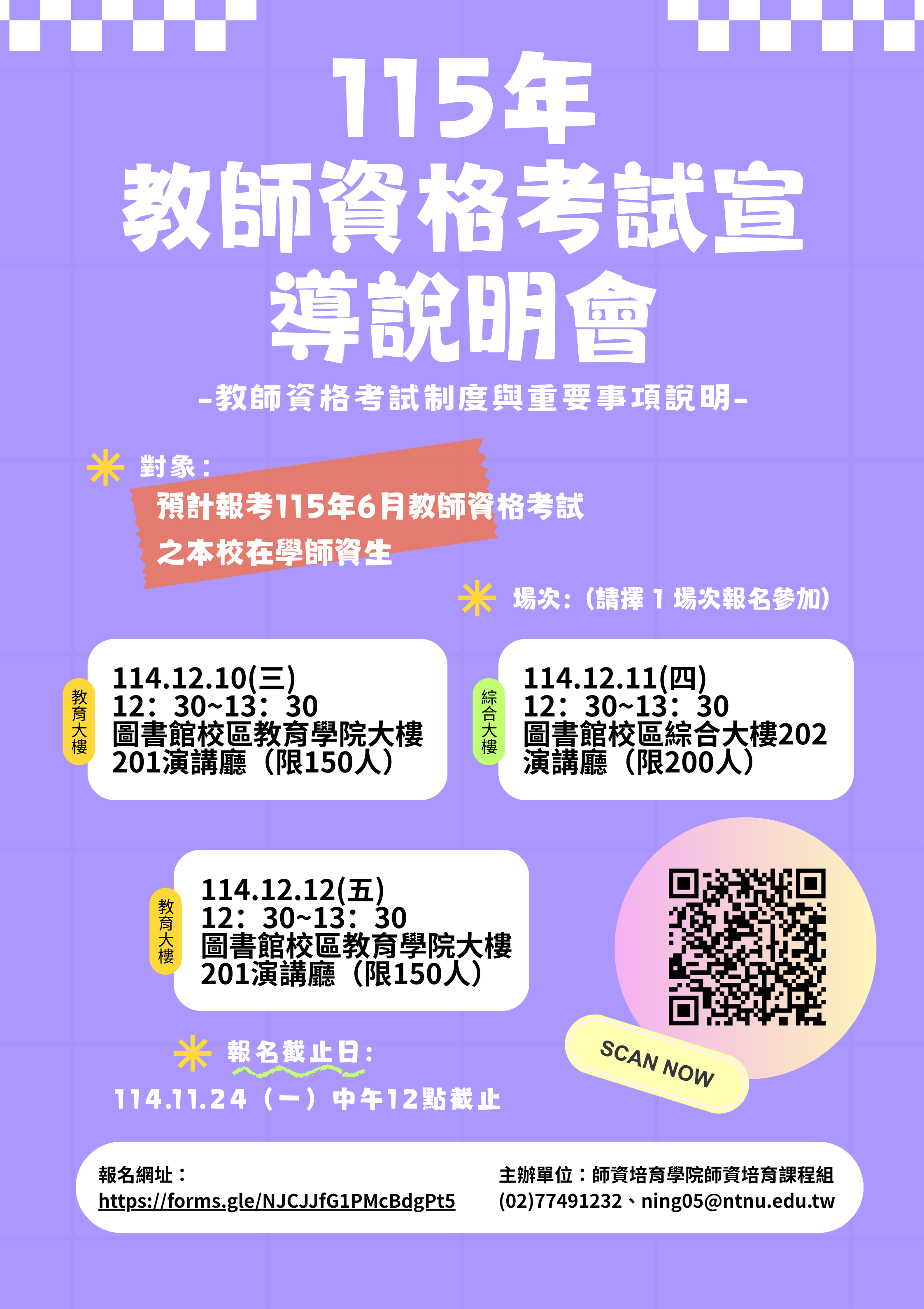 對象:預計報考115年6月教師資格考試之本校在學師資生