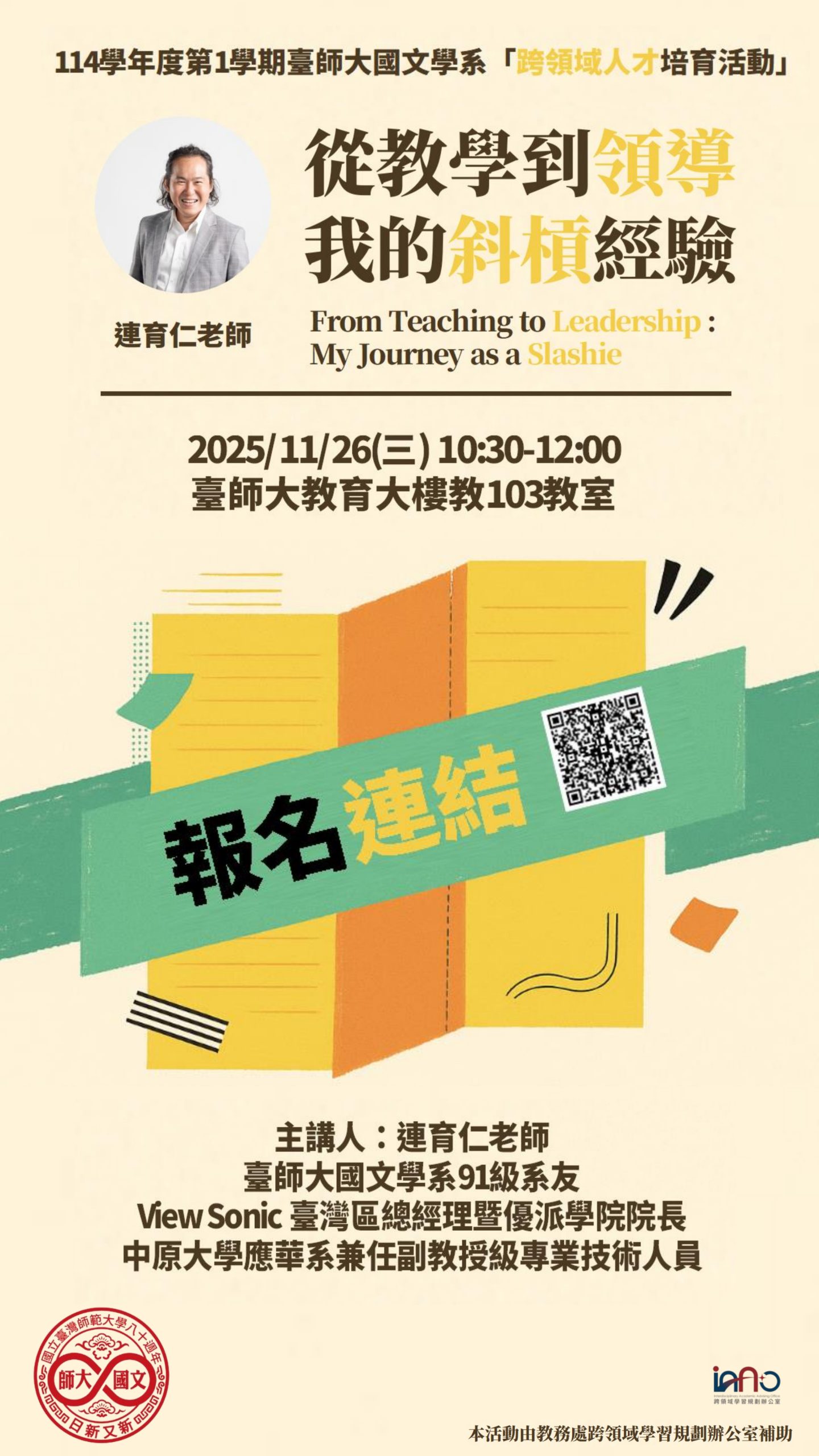 114學年度第1學期臺師大國文學系「跨領域人才培育活動」 題目:From Literature to Leadership: My Journey as a Slashie從教學到產業:我的斜槓經驗主講人:連育仁老師(臺師大國文學系91級系友View Sonic 臺灣區總經理暨優派學院院長中原大學應華系兼任副教授級專業技術人員)時間:11/26(三)10:30-12:00地點:臺師大教育大樓教103教室 海報下載 Post author:系行政 Post published:2025-11-13