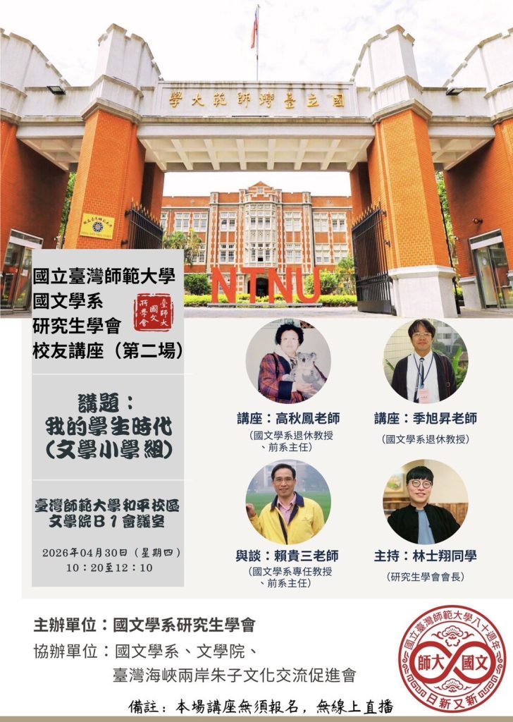 國立臺灣師範大學國文學系研究生學會-校友講座(第二場) 🌟講題:我的學生時代(文學小學組) 🌟講座: 1.高秋鳳教授(本學系退休教授、前系主任) 2.季旭昇教授(本學系退休教授) 🌟討論人:賴貴三教授(本學系專任教授、前系主任) 🌟主持人:林士翔同學(所學會會長) 🌟時間:115年4月30日(星期四)上午10時20分至12時10分 🌟地點:文學院B1會議室 ☀️主辦單位:國文學系研究生學會 ☀️協辦單位:國文學系、臺灣海峽兩岸朱子文化交流促進會 ‼️備註:本場講座無需報名,無線上直播 Post author:系總務 Post published:2026-04-17